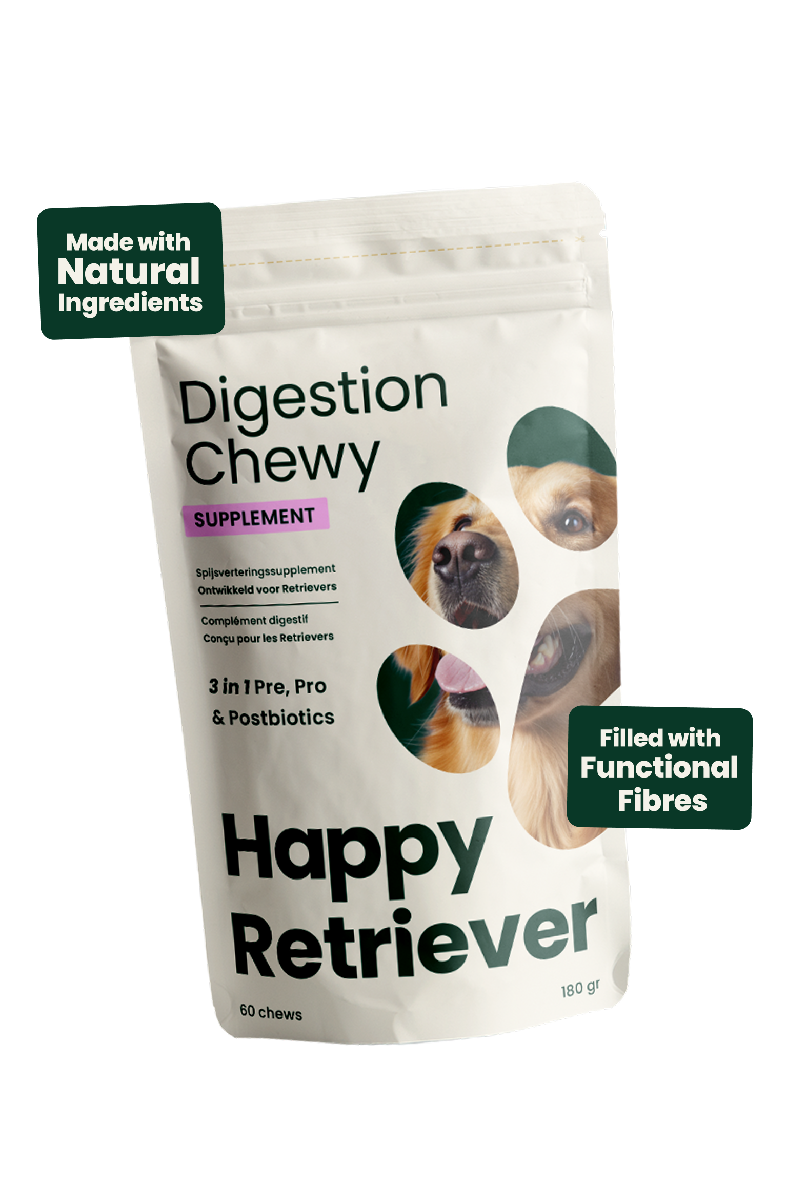Functionele soft chews, speciaal ontwikkeld ter ondersteuning van een evenwichtige spijsvertering en een gezonde darmflora bij Retrievers. Dankzij prebiotica, probiotica en natuurlijke vezels dragen deze chews bij aan een gezonde spijsvertering, een betere opname van voedingsstoffen en darmcomfort.